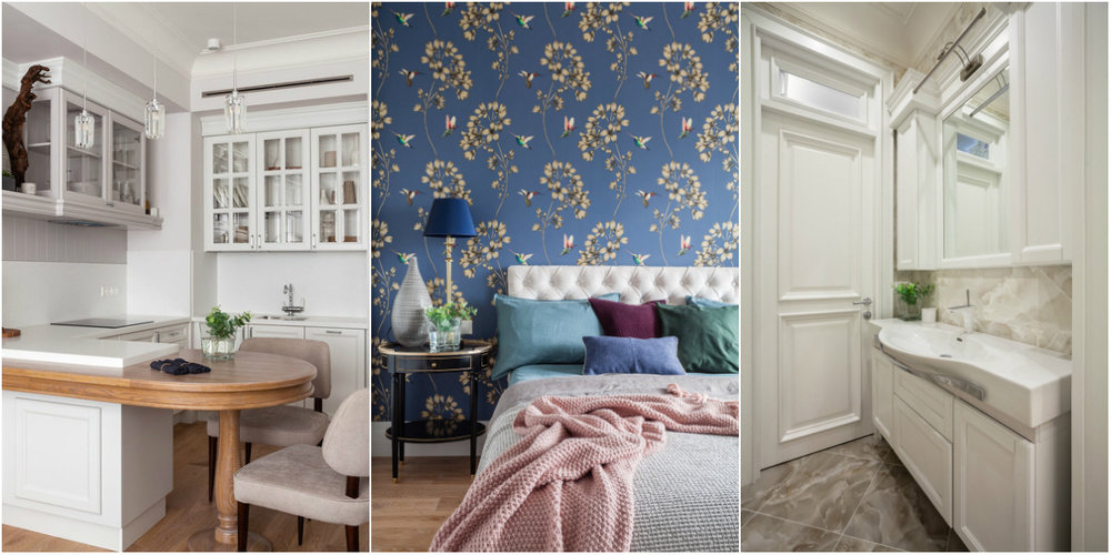 Из соображений экономии двери, полы – российского производства. На стенах – краска и красивые синие обои с растительным принтом в спальне. Столешница из искусственного камня переходит и на кухонный фартук, поэтому обошлись без плитки.