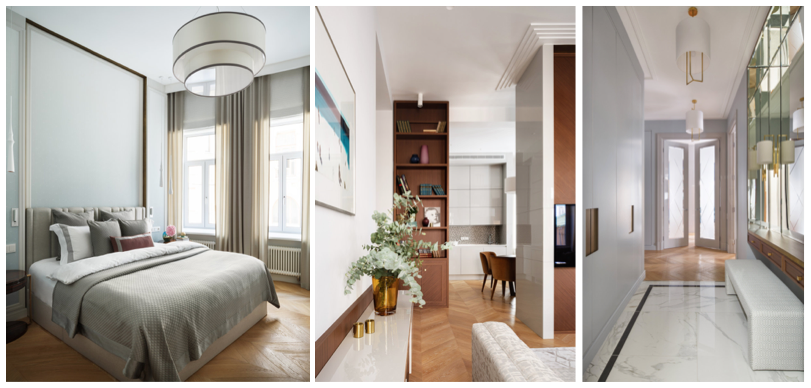 «Все помещения у нас получились масштабные за счет пропорций, – продолжают дизайнеры. – Двери высотой 2,7 метра, кухня, библиотека и гардеробные стеллажи до потолка, высокие окна. Каждый, кто заходит в квартиру, сразу чувствует масштаб. Мы этого и добивались».
