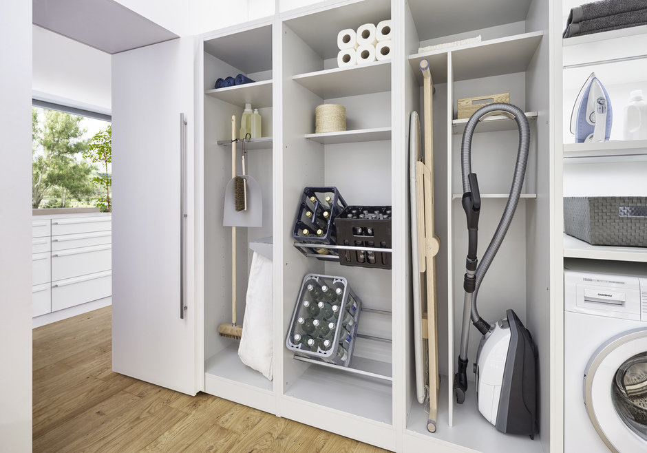 Внутри куба располагается потайная комната-кладовая, в которой можно хранить кухонную утварь, оборудование для уборки, стирки и других бытовых дел. Попасть в «комнату в комнате» можно через незаметную дверь напротив острова, но гости вряд ли смогут об этом догадаться — разве что домашние разболтают.