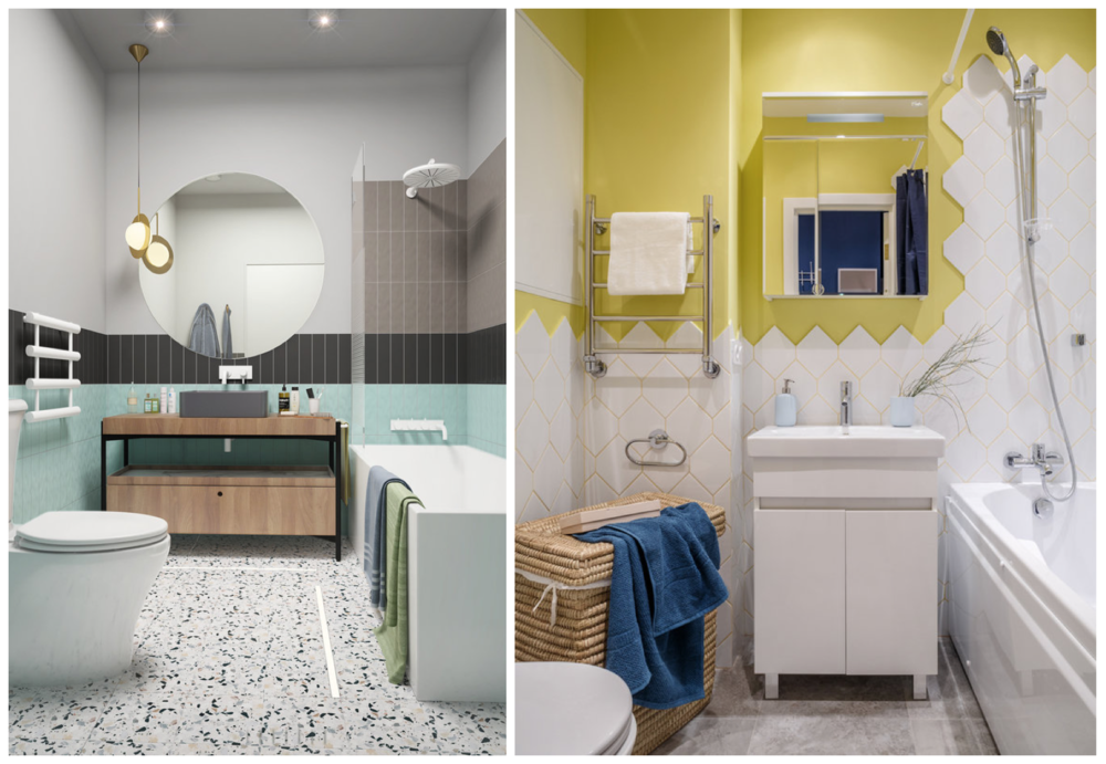 Оранжевый, синий, изумрудный и бледно-зеленый, пудровый розовый цвет — эти оттенки можно смело добавлять в интерьер ванной комнаты.