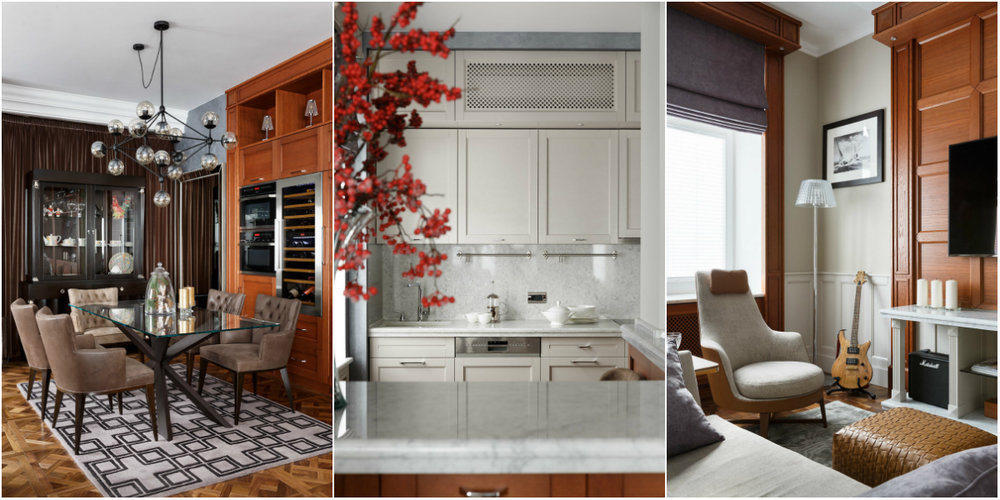 Богатая отделка натуральными материалами — то, что сразу привлекает внимание в этом интерьере. Дизайнер использовал много дерева: массив дуба, ореха, шпоны редких пород дерева, натуральный камень. Причем деревянные здесь не только встроенные шкафы и корпусная мебель, но и оконные откосы, решетки радиаторов, изголовье кровати и часть стен в ванной комнате.