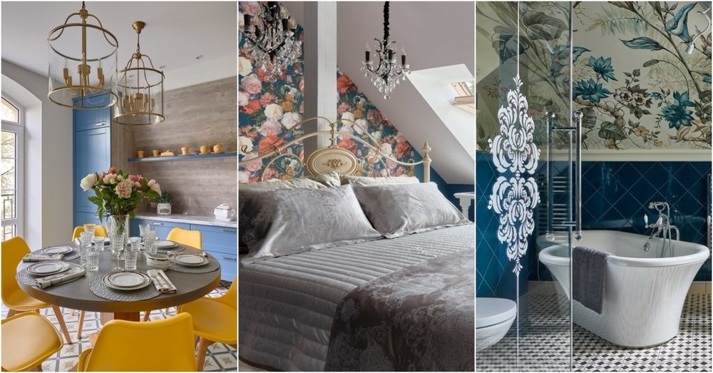 В отделке активно использовали краску ярких оттенков. Например, для холла и коридора выбрали сочетание серого и горчичного, на кухне — горчичного и синего. В спальнях подобрали более спокойные цвета, но использовали дизайнерские обои с цветочным принтом. Даже санузлы превратили в цветущий сад с диковинными растениями.