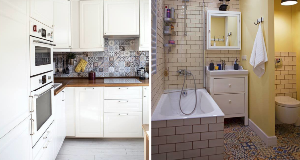 Первым делом дизайнер затеяла функциональную перепланировку. Маленькую ванную комнату, санузел и небольшой коридор объединили в одно удобное помещение. Входом на кухню пришлось пожертвовать, зато сама она получилась вместительнее.