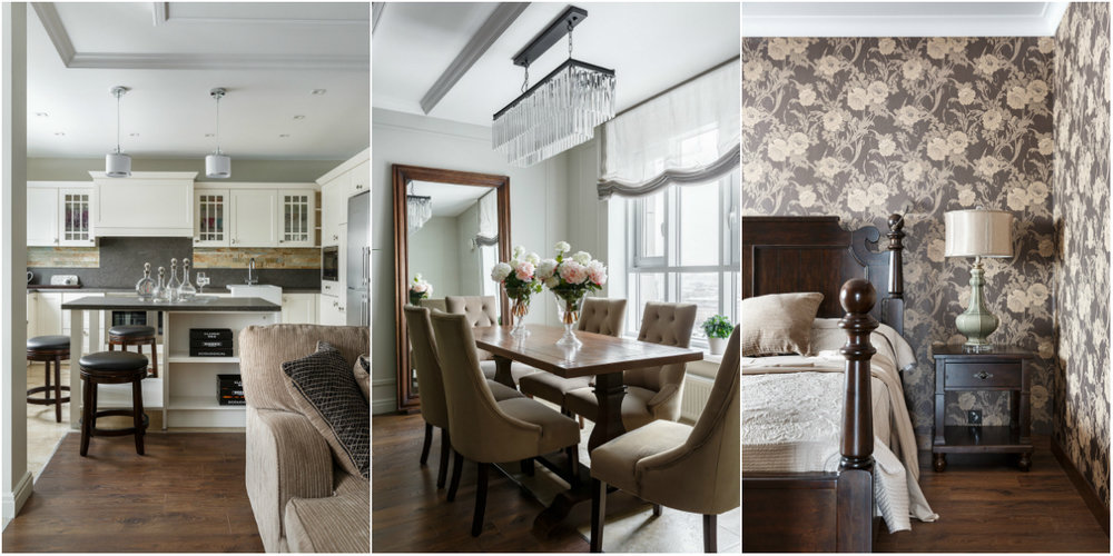 Работу над проектом начали с перепланировки: получились две просторные спальни с отдельными гардеробными, кухня, гостиная-столовая, кабинет и несколько ванных.