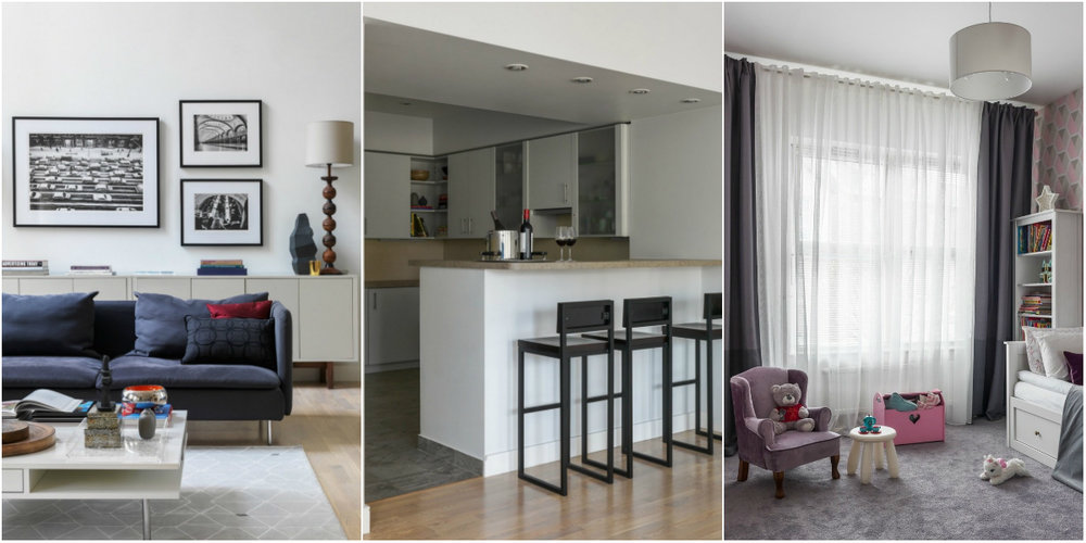 За основу колористического решения интерьера взяли родной для владельцев квартиры Манхэттен. В гостиной появились оттенки серого — как стекла небоскребов, и разные вариации синего — напоминание об океане.