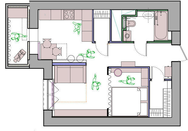 Дизайнер Яна Грошева превратила однушку в блочной новостройке в двухкомнатную квартиру с кухней-гостиной. Для этого потребовалось лишь перенести дверной проем и установить вместо обычной балконной двери распашную. Минимальная перепланировка сделала зону гостиной одновременно более уютной и функциональной.