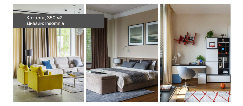 Заказчики видели свой дом современным, с яркими, но не кричащими акцентами. Авторы проекта поддержали идею и взяли за основу спокойные светлые оттенки (серый, бежевый, кофейный) и разбавили их яркими пятнами. Так, в интерьере появился синий кухонный гарнитур, желтые кресла и полотенцесушитель, красные детали в декоре детской.