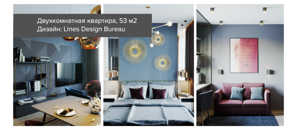 Цветовая палитра построена на разных оттенках серого с вставками приглушенных синих и бордовых тонов, которые очень нравятся заказчице, с золотыми акцентами в отделке стен, светильниках и мебели.