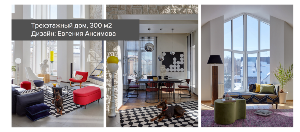 Большую часть первого этажа заняла двусветная гостиная площадью почти сорок метров, кухня-столовая, хозяйственные помещения и кабинет хозяйки. На втором этаже разместились три спальни с ванной комнатой, на третьем — еще две спальни, еще одна ванная и кабинет хозяина. Владельцы хотели, чтобы в доме собиралась вся семья, дети и внуки, и всем было комфортно.