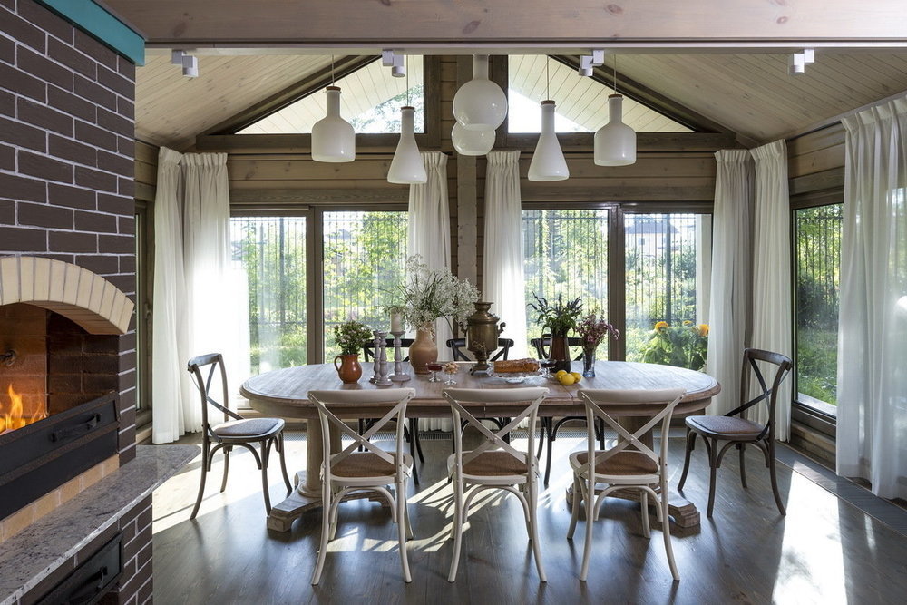Так, как это сделала архитектор Елена Кунците. Тогда беседка станет многофункциональной — будет служить одновременно и столовой, и кухней и террасой. С солнечными лучами и дождем здесь справится тент с автоматической системой открытия, а дровяной гриль с куполом-вытяжкой на кухне заменит камин.