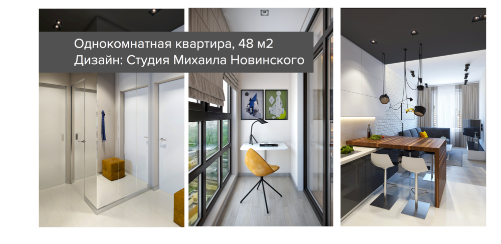 Для дизайнеров этот проект стал настоящим вызовом: на площади всего 48 квадратных метров нужно было разместить несколько функциональных зон и максимум мест для хранения. Профи сделали ставку на удобную планировку с изолированными комнатами и «поиграли» с отделкой: графитовый потолок и зеркальные стены — только часть дизайнерских экспериментов.