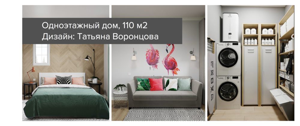 Одноэтажный дом построен по типовому проекту. На 110 квадратах разместили просторную кухню-гостиную, спальню, кабинет, детскую, гардеробную и два санузла. В одном санузле получилось найти место для полноценной ванны, а во втором установили душевую кабину — зато часть площади отвели под постирочную.
