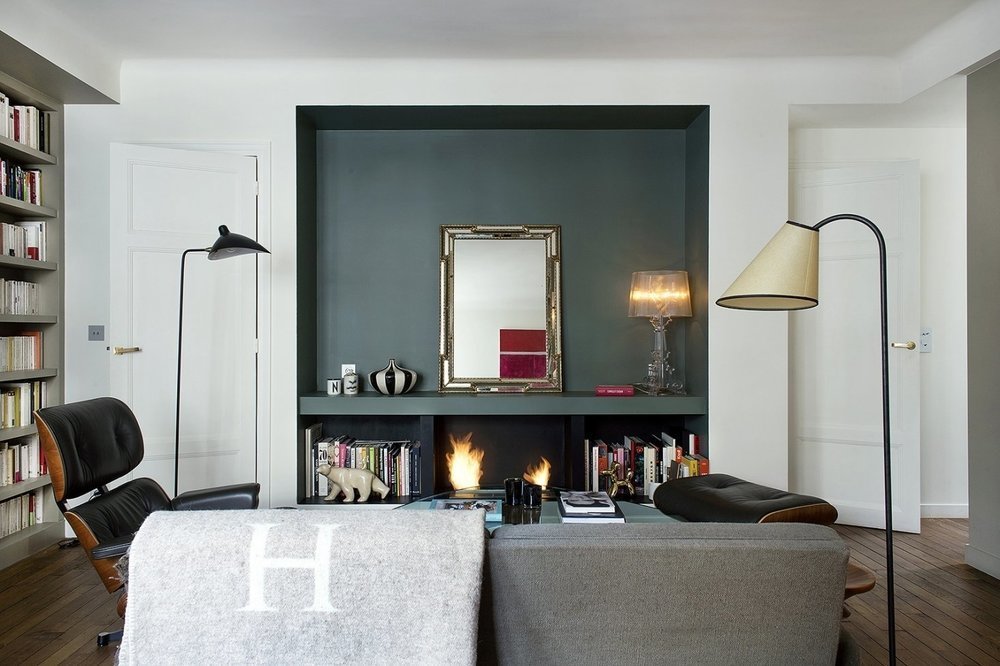 Филипп выкрасил нишу в гостиной в темно-зеленый цвет. В сочетании с белыми стенами этот оттенок придал пространству дополнительную глубину. К тому же он отлично сочетается с напольным покрытием и по-разному смотрится в зависимости от освещения.