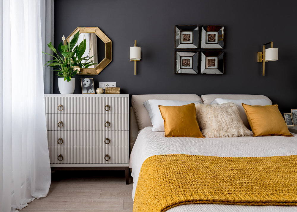 Темные графитовые стены и горчично-желтые акценты — стильное решение для спальни.