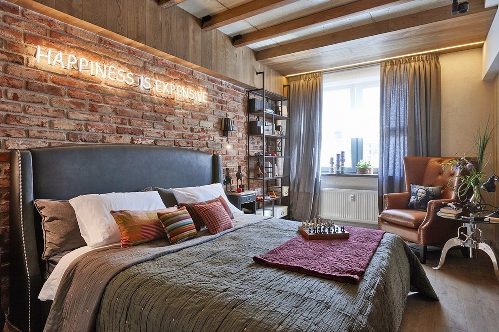 Кто сказал, что стена не может быть говорящей? Разместите над кроватью деревянные слова или фразы, которые имеют для вас значение. Дизайнер Ольга Райская в спальне в стиле лофт пошла дальше и использовала гибкую светодиодную подсветку — получилась альтернатива ночнику.