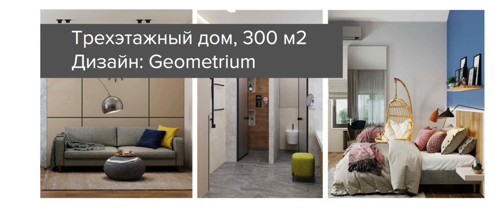 Во всех спальнях на полу будет инженерная доска, в кухне и гостиной — керамогранит. Стены — под покраску, на первых двух этажах использовали декоративную штукатурку под бетон и стеновые шпонированные панели. В «мокрых» зонах сочетали керамогранит и рейки.