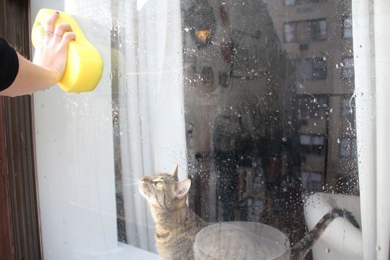 Для чистки больших окон используйте щетку с длинной ручкой. Если она скрипит во время мойки, добавьте в воду чуть больше мыла. И обязательно пройдитесь по стеклам обычной водой в конце уборки: чистящие средства могут повредить материал уплотнителя.