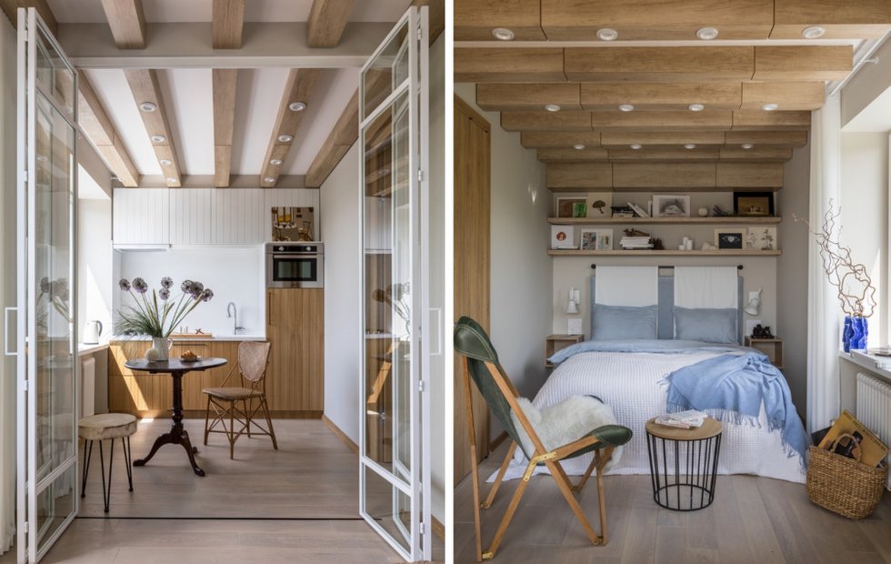 Квартира досталась в «убитом» состоянии, поэтому ее полностью вычистили, поменяли окна и батареи. Не обошлось и без перепланировки: проход в жилую комнату сделали через кухню, а для зонирования использовали прозрачную дверь-перегородку от компании Makeloft. Потолок опускать не стали, но украсили его деревянными балками, в которые встроили светильники.