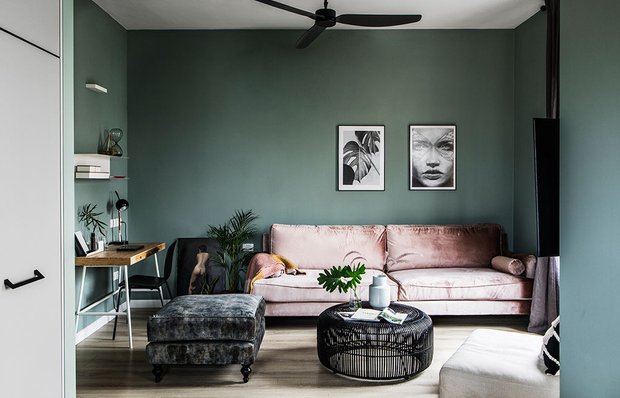 Площадь этой квартиры в израильском городе Гиватаим — 73 квадрата, так что в ней нашлось место для просторной гостиной, плавно перетекающей в кухню. Центральное место здесь занял диван, обитый нежно-розовым бархатом. Цветовую палитру дополнили белое кресло Kartell и серая бархатная оттоманка.