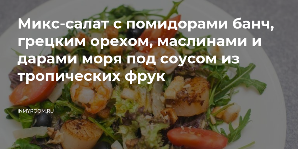 Выложить салат-микс на тарелку, сверху добавить обжаренные дары моря, грецкий орех, помидор банч, оливки (целые), посолить, поперчить. При подаче полить соусом и посыпать гренками.