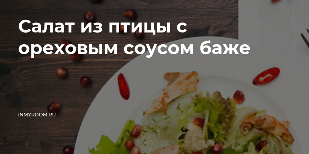 Ингредиенты:- Курица гриль крупная (лучше отварная) – 1 шт.- Яйца (вареные) – 5 шт.- Грецкие орехи – 200 г- Гранат красный спелый – 1 шт.- Латук – 1 кочан- Айсберг – 1 кочан- Лоло россо – 1 кочан- Укроп – 1 пучок- Лук зеленый – 1 пучок- Тархун – 1 пучок- Кинза – 1 пучок- Хмели-сунели – 1 ст. ложка- Уксус белый винный- Чеснок – 3 зубчика- Сливочное или топленое масло- Соль, черный перецСпособ приготовления:1) Птицу разобрать на волокна или нарезать тонкими полосками. Обжарить в топленом масле до хрустящей корочки.2) Измельчить в блендере грецкие орехи с чесноком и кинзой, добавить винный уксус, хмели-сунели, соль и перец.3) Измельчить вареные яйца, тонко нашинковать зеленый лук, тархун и укроп.4) Разобрать гранат на зерна.5) Нарвать зеленые листья салата и выложить на широкое блюдо. Смешать в миске мясо, яйца, гранат, зелень, лук и уложить на салат.6) Полить сверху ореховой заправкой.