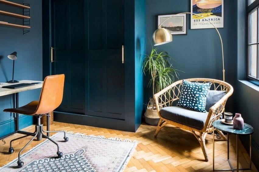 Почти во всех комнатах стены выкрасили в белый цвет. А вот "мрачную темницу" превратили в домашний офис со стенами модного синего оттенка. На пол положили дубовый паркет, а стол изготовили из натурального дерева на заказ. Причем сделать отдельно столешницу и купить ножки оказалось дешевле, чем найти готовую модель.
