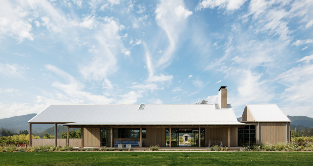 Архитекторы разработали проект одноэтажного п-образного дома. Внешне он напоминает большой амбар: фасад отделан деревом, а остроконечные крыши обшиты металлом. Благодаря панорамным окнам в любое время можно наслаждаться потрясающим видом на виноградники и горы.