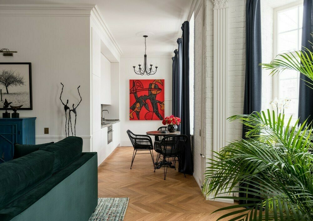 «Квартира была „убитой“, но, несмотря на плохое техническое состояние, мы сразу разглядели потенциал. Эркер, красивые окна, высокие потолки, колонны, лепнина вдохновили сохранить дух старой Москвы, — рассказывают дизайнеры. — Не хотелось перегружать пространство. Плюс нам нужно было разместить коллекцию современного искусства заказчика: она у него большая и постоянно пополняется».