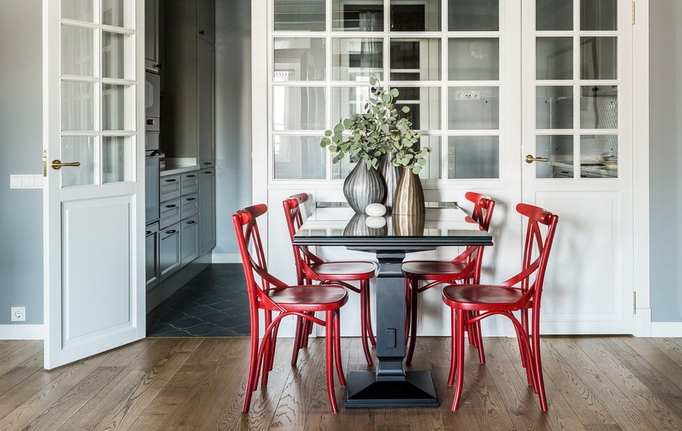 «Идея интересная: стол частично находится в кухне, а частично — в гостиной. При этом конструкция стены позволяет открывать дверцы, расположенные в нижней части перегородки, и передвигать стол в гостиную как целиком, так и на любую удобную длину. У стола внушительный вес, что исключает даже минимальное расшатывание стены в процессе эксплуатации», — рассказывает автор проекта.