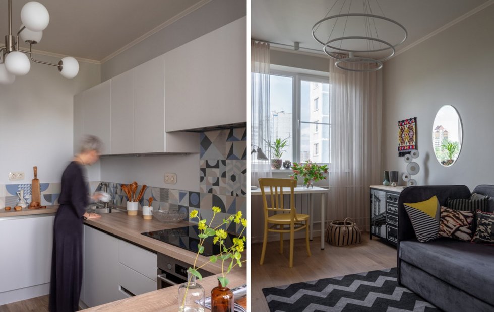 Для отделки стен выбрали покраску. На кухне спроектировали большую рабочую поверхность, использовав единую столешницу сложной формы. Фартук сделали из акцентной плитки с геометрическим узором — смотрится стильно и гармонично.