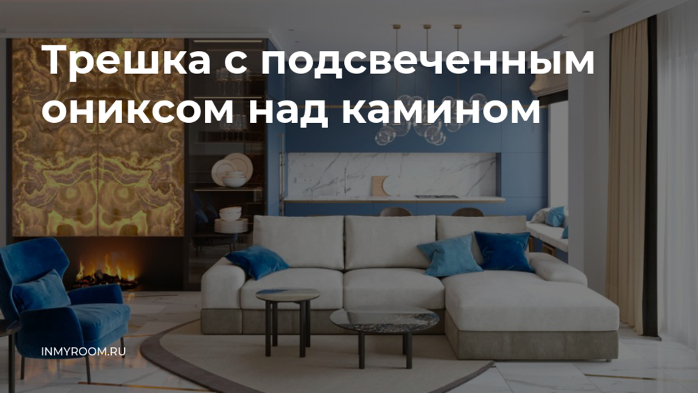 Чтобы подчеркнуть единство стиля, для всех помещений выбирали одинаковые отделочные материалы. Интерьер выполнен в общей спокойной цветовой палитре с упором в благородный синий. Чтобы его оживить, дизайнер использовала яркие акценты. Например, над камином появился подсвеченный оникс, который продолжает тему огня и добавляет гостиной уюта.