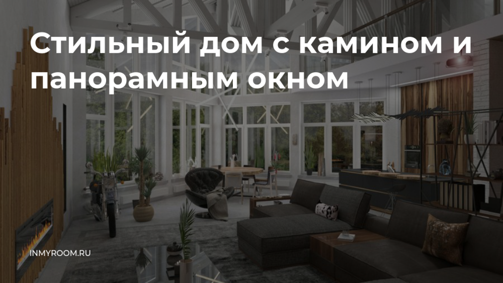 Благодаря большому панорамному окну сосновый лес тоже становится частью интерьера, в котором все стремится к простоте, естественности и гармонии. Холодный инертный бетон, панорамное остекление и видимые конструктивные элементы делают интерьер строгим и лаконичным. На контрасте выделяются живые яркие акценты: дерево, огонь, текстиль, кирпич, растения и мотоцикл — напоминание о летнем хобби автора проекта.