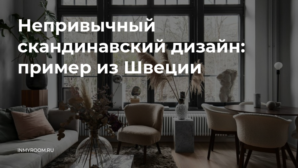 Дизайнеры решили не идти по протоптанной дорожке скандинавского подхода и добавили в интерьер гостиной много черных деталей. За счет высоты потолков и хорошего освещения они не сливаются в одно мрачное пятно, а, наоборот, играют на контрасте с белыми стенами. К тому же бежевый текстиль (бархат, плюш) и ковер «шегги» делают черный декор менее строгим.
