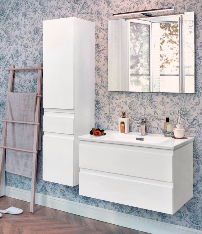 А если площадь ванной позволяет — дополните тумбу функциональной подвесной колонной, и можете забыть о прочих полках и нишах!
