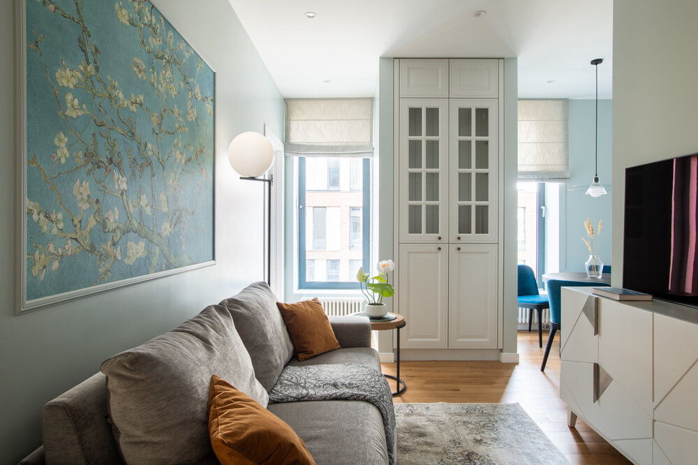 «Заказчица впервые увидела картину Ван Гога с цветущими ветками миндаля, путешествуя по Европе. Она долго мечтала о таком изображении у себя дома. Мечта осуществилась в новой квартире», — рассказывает Андрей Байков.