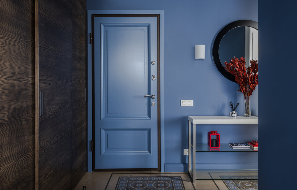 Дизайнеры из Line Design Studio решили сделать входную группу акцентной. Так, входную стену и дверь выкрасили в один сине-голубой оттенок плюс дополнили стену деревянными контрастными рейками.