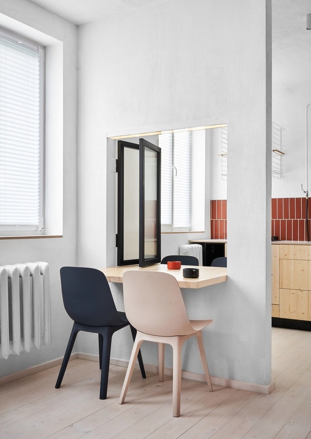 Еще одно нестандартное решение подсмотрели в проекте дизайнеров из Line Design Studio. Эту однушку оформляли для сдачи в аренду. Кухню объединили с гостиной, а в стене между двумя помещениями сделали раздвижное окно со встроенным обеденным столом. При закрытых окне и двери кухня становится изолированной.