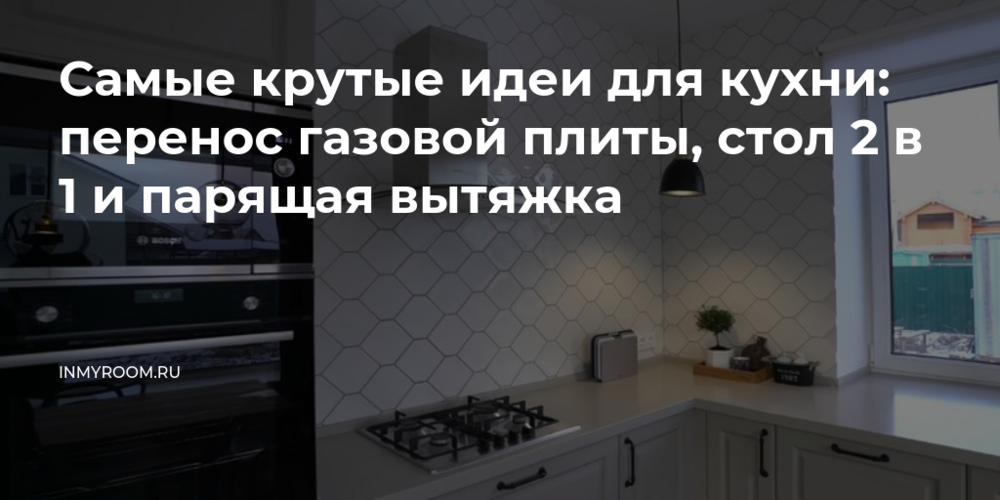На этой кухне вытяжка как будто парит в воздухе. Такое впечатление создается благодаря вытяжной трубе, вмонтированной в стену, которую декорировали керамической плиткой.