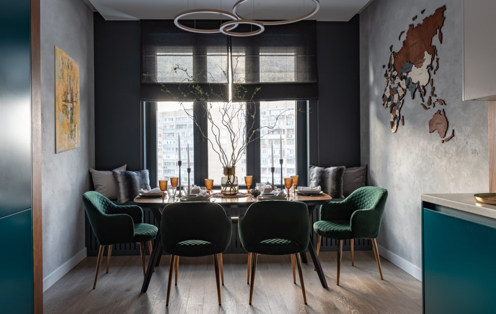 Для отделки выбрали моющуюся краску — она красиво смотрится, и ее легко мыть. На кухне для акцента на стены нанесли штукатурку под бетон.