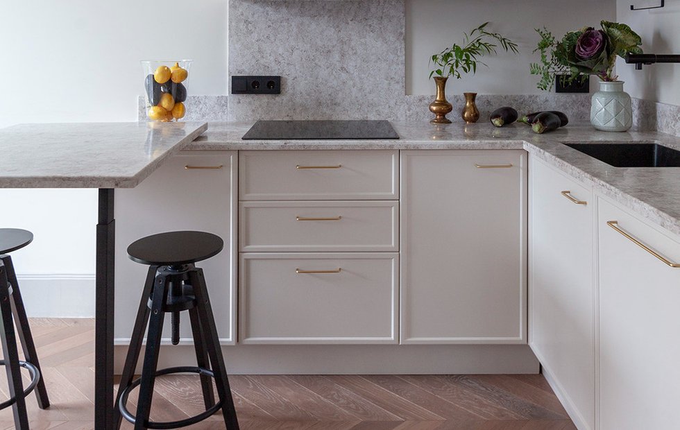 Кухня состоит из нескольких частей. Угловой гарнитур выполнили практически до потолка, организовав двойной ряд верхних шкафов — для многочисленного хранения. От зоны гостиной рабочую зону отделили барной стойкой — она здесь вместо обеденного стола.