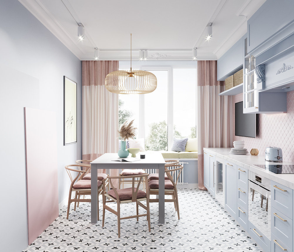 На кухне группа небольших потолочных светильников соседствует с акцентной люстрой, висящей над столом. В большой детской установили двухуровневую кровать с удобной лесенкой: у каждого есть собственный свет и шторки. Получилось атмосферно и очень уютно.