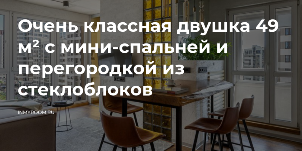 «Фишкой интерьера можно назвать стеклоблоки медового оттенка на стене возле барной стойки. Они хорошо пропускают свет из спальни, а в солнечную погоду дают еще и красивый свет. В поддержку такому решению между гостиной и спальней сделали стеклянные раздвижные двери в похожем оттенке», — рассказывает дизайнер.