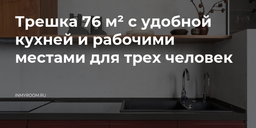 Дизайнер Евгения Матвеенко с командой студии FLATS DESIGN оформила трешку 76 кв. м для семьи из трех человек — работающие родители и сын, абитуриент ВУЗа. Для всех нужно было выделить рабочие зоны — в спальне, комнате сына и в гостиной. Также был запрос на два санузла, места для хранения. Муж с женой были не против экспериментов и попросили добавить глубокого темного винного цвета, а комната сына получилась темной по его желанию.