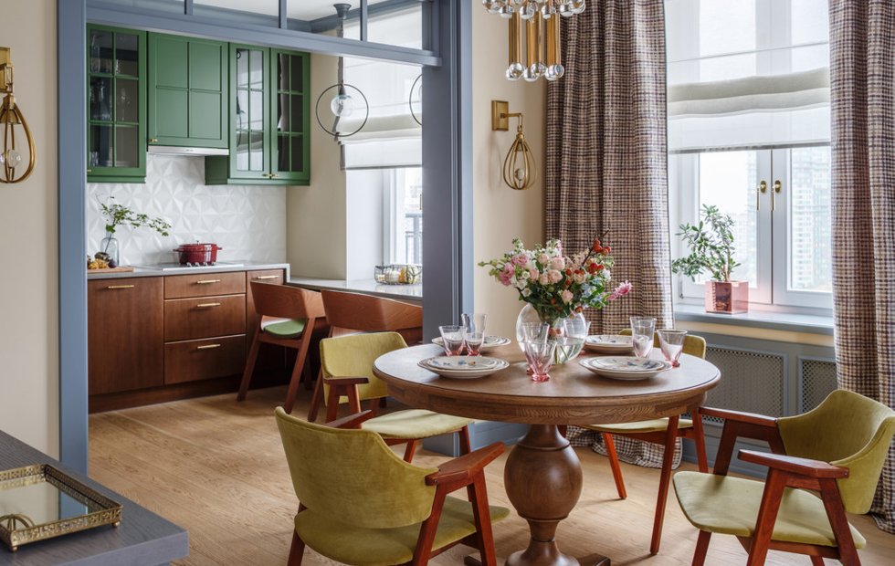 Заказчица пришла к Наде Зотовой за ее фирменным стилем. «Она хотела яркий эклектичный интерьер», — говорит дизайнер. Для стен подобрали нерастиражированные оттенки краски: для гостиной взяли не серый, а сложный желтоватый цвет, в спальне использовали сочный ягодный оттенок, в кабинете — цвет морской волны. На пол во всех комнатах положили натуральное дерево: один вид покрытия помогает объединить такие разные интерьеры.