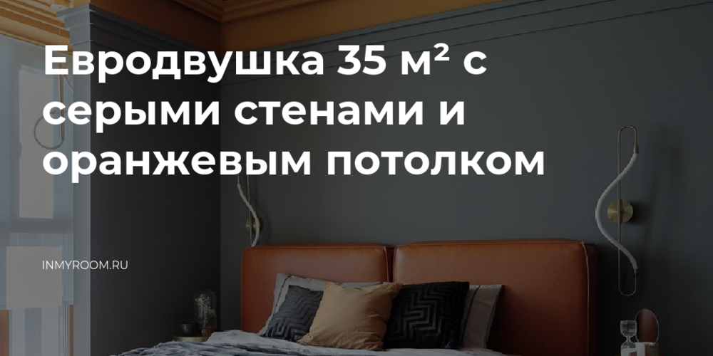 Самой яркой деталью интерьера является решение потолка в спальне: двухрядный декоративный карниз с подсветкой по периметру комнаты стал цветовой границей плоскостей. Потолок выкрашен в сложный оранжевый оттенок, заходящий на стены — получается эффектный контраст с темно-графитовыми стенами.