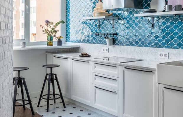 Стены покрасили светлой краской, а на пол положили ламинат Egger. В прихожей и детской поклеили обои Cole & Son, а в спальне — Harlequin. Яркие акценты создала плитка ручной работы Prima Keramika и Luxemix — например, кухонный фартук выложен необычной голубой плиткой в виде рыбьей чешуи.