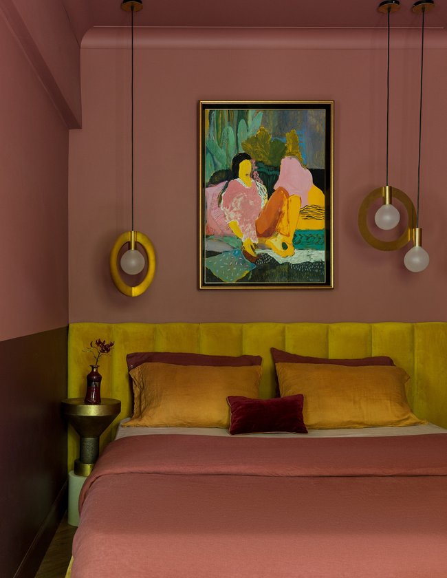 Спальня вытянутая и узкая, поэтому кровать встала как в нишу. Верхнюю часть стен и потолок выкрасили в один оттенок, чтобы создать ощущение «драгоценной шкатулки». Нижняя часть стен — в более насыщенном баклажанном оттенке — эффектное решение.