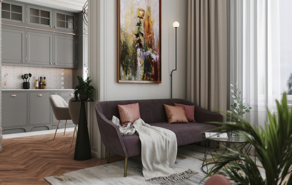 «Цветовая палитра интерьера — это пожелание хозяйки. Кухня+гостиная в сером оттенке (либо цвет „яичной скорлупы“), прихожая-коридор в серо-зеленом оттенке, спальня в серо-розовом оттенке (заказчица дала необычное определение этому цвету — „цвет тухлой розы“)», — рассказывает дизайнер.