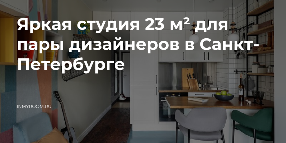 В этой малогабаритке живет семейная пара — дизайнеры, основатели студии Vizdiz. На 23 м² они создали комфортное пространство для работы и отдыха. Главный дизайнерский прием, который использовали в оформлении — зонирование при помощи материалов. Кухня, прихожая и балкон выделены цветовыми пятнами по полу и разной отделкой стен. В выборе оттенков хозяева себя не ограничивали, создавая сложные контрастные сочетания.
