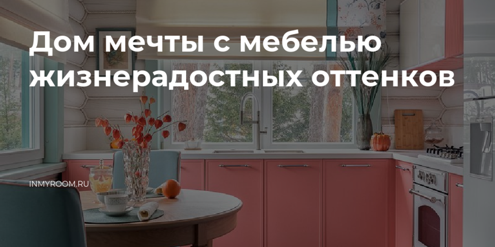 За счет окон в кухне много света. Гарнитур установили углом, с мойкой около окна. Для фасадов выбрали насыщенный коралловый оттенок — он идет как нежное дополнение к полу. Напольное покрытие — плитка бирюзового цвета с песчаными разводами, напоминает морскую воду и песок. Отсюда и название проекта «Сосновый океан» — океан, который находится в сосновом лесу.